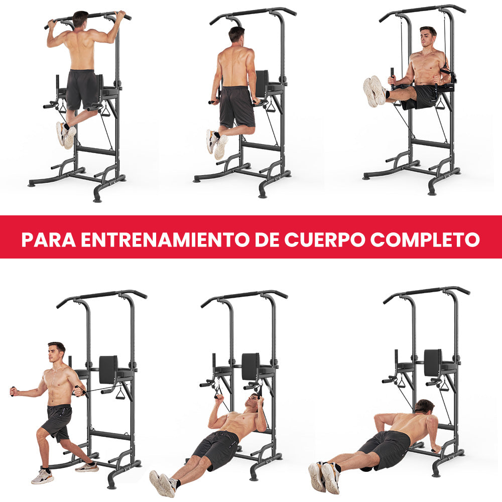 Diseñado con una barra de dominadas, una barra de flexiones y una barra de inmersión, puede ayudarle en elevaciones de piernas/rodillas, dominadas, flexiones, dominadas con cuerda y mucho más.