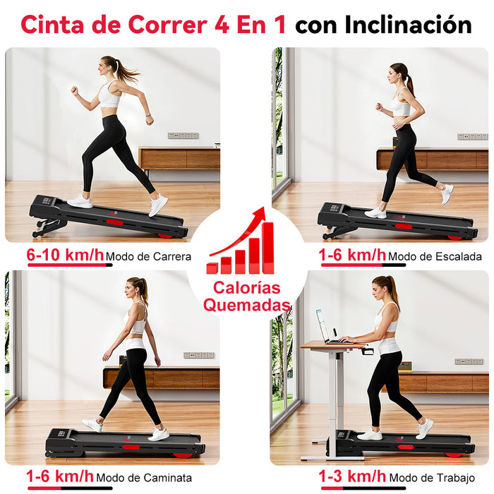 Cinta de correr versátil 4 en 1 con un rango de velocidad de 1 a 10 km/h, diseñada para trabajar, caminar, escalar y correr.